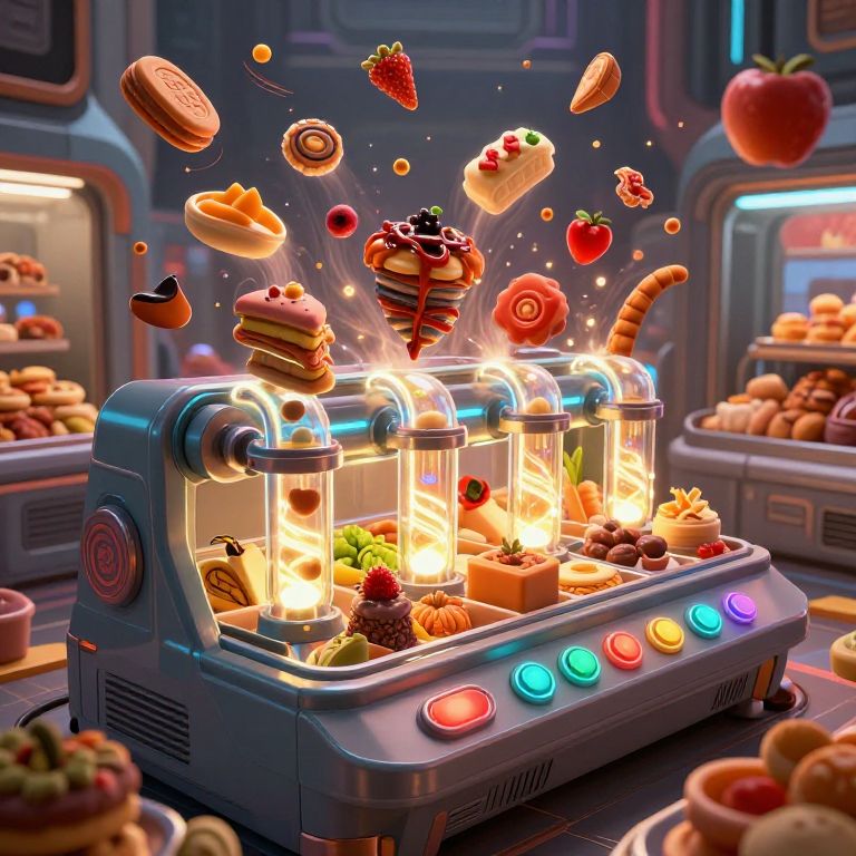 Food generator device in a sci-fi market, crafting exotic and imaginative food items, glowing tubes and buttons, diverse food ingredients swirling around, vibrant and dynamic scene, detailed environment, concept art, cinematic lighting