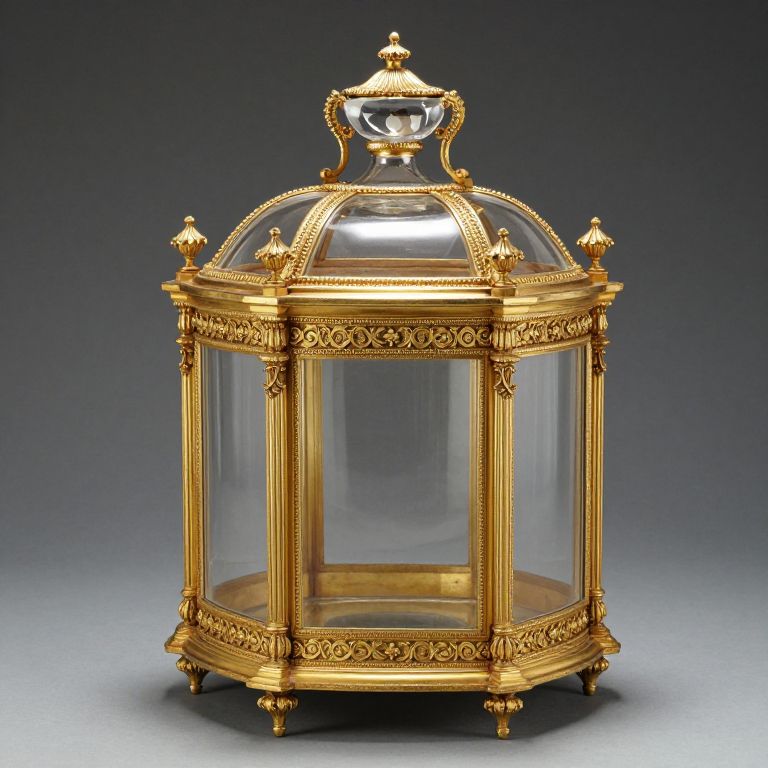 French gilt bronze and crystal open tantalus showcasing intricate ornamental details, featuring a clear glass body encased by a golden frame with decorative finials, handles, and a domed lid atop, all resting on a polished surface.