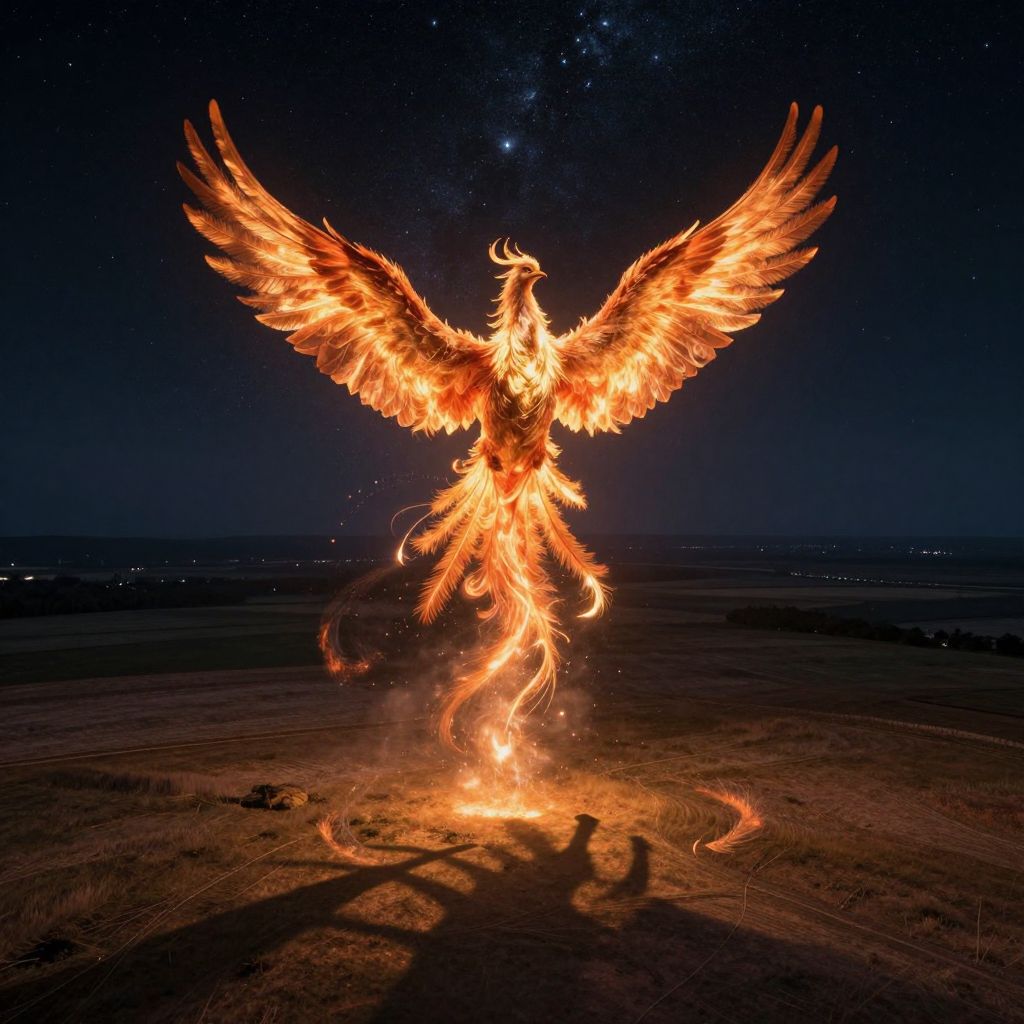 Photograph of a fiery phoenix with outstretched wings, glowing orange and yellow, standing on a dark, starry night landscape.