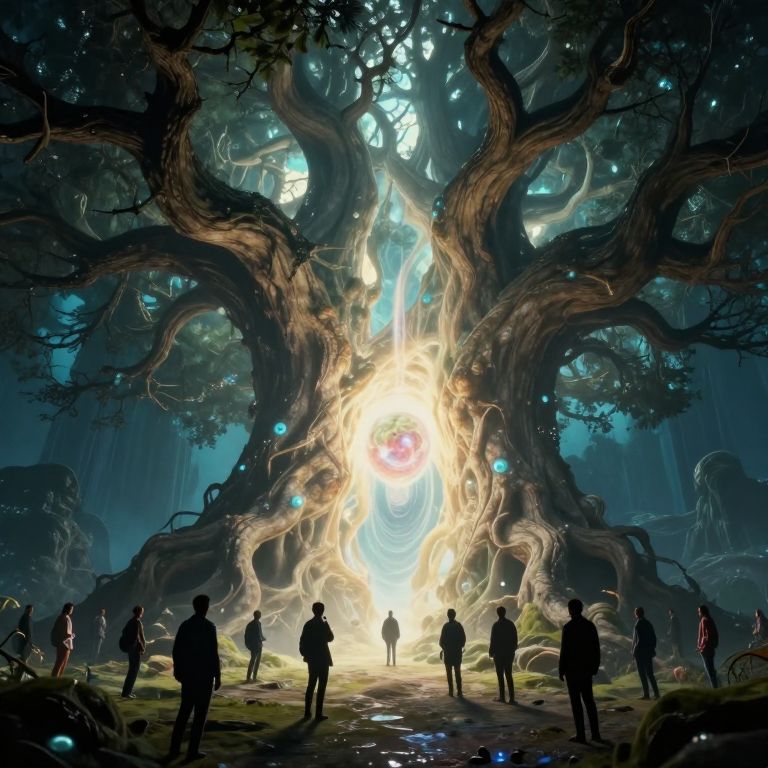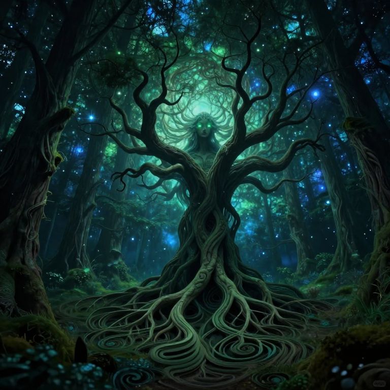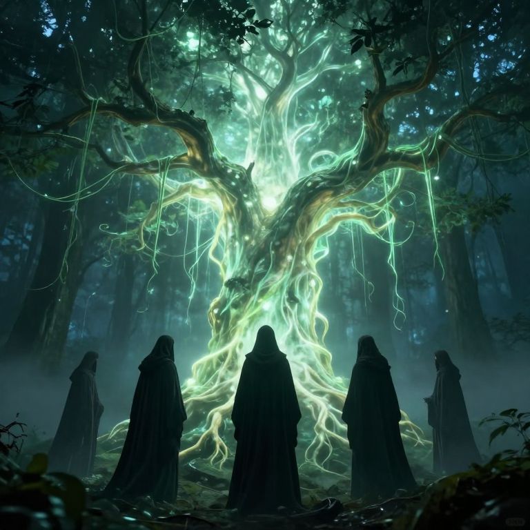 Mystical figures in dark cloaks stand before a radiant, glowing tree with roots extending upward into the misty forest canopy, as ethereal green tendrils cascade down its luminous trunk.