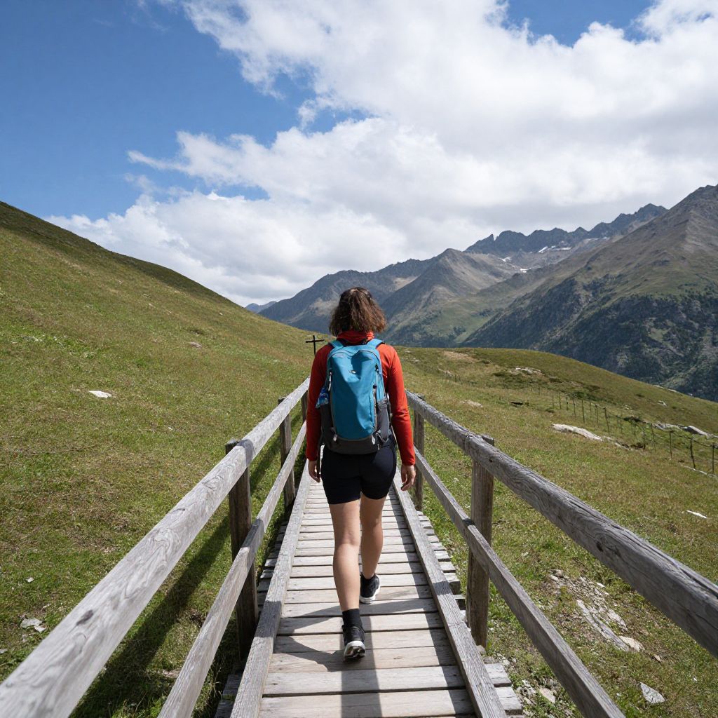 Photograph of a person hiking on a wooden bridge in a mountainous landscape. The hiker, viewed from behind, wears a bright red long-sleeve shirt, black shorts, and a blue backpack. They have short, dark hair and are walking with one hand on the wooden railing. The bridge spans a grassy hill, leading to a range of mountains in the background under a partly cloudy sky. The green grass contrasts with the blue sky and white clouds, while the mountains are a mix of green and brown hues. The image captures the serene, expansive outdoor scenery.