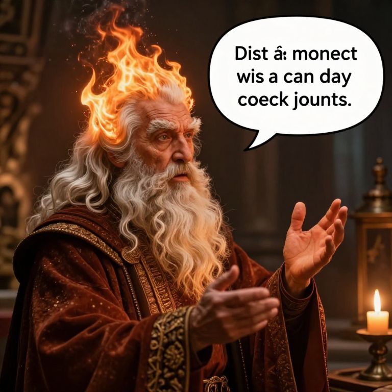 Photograph of a wizard with a fiery orange and yellow flame on his head, wearing a dark, ornate robe, speaking a speech bubble saying,