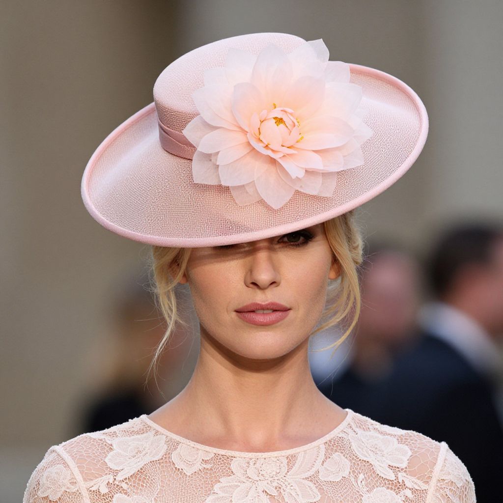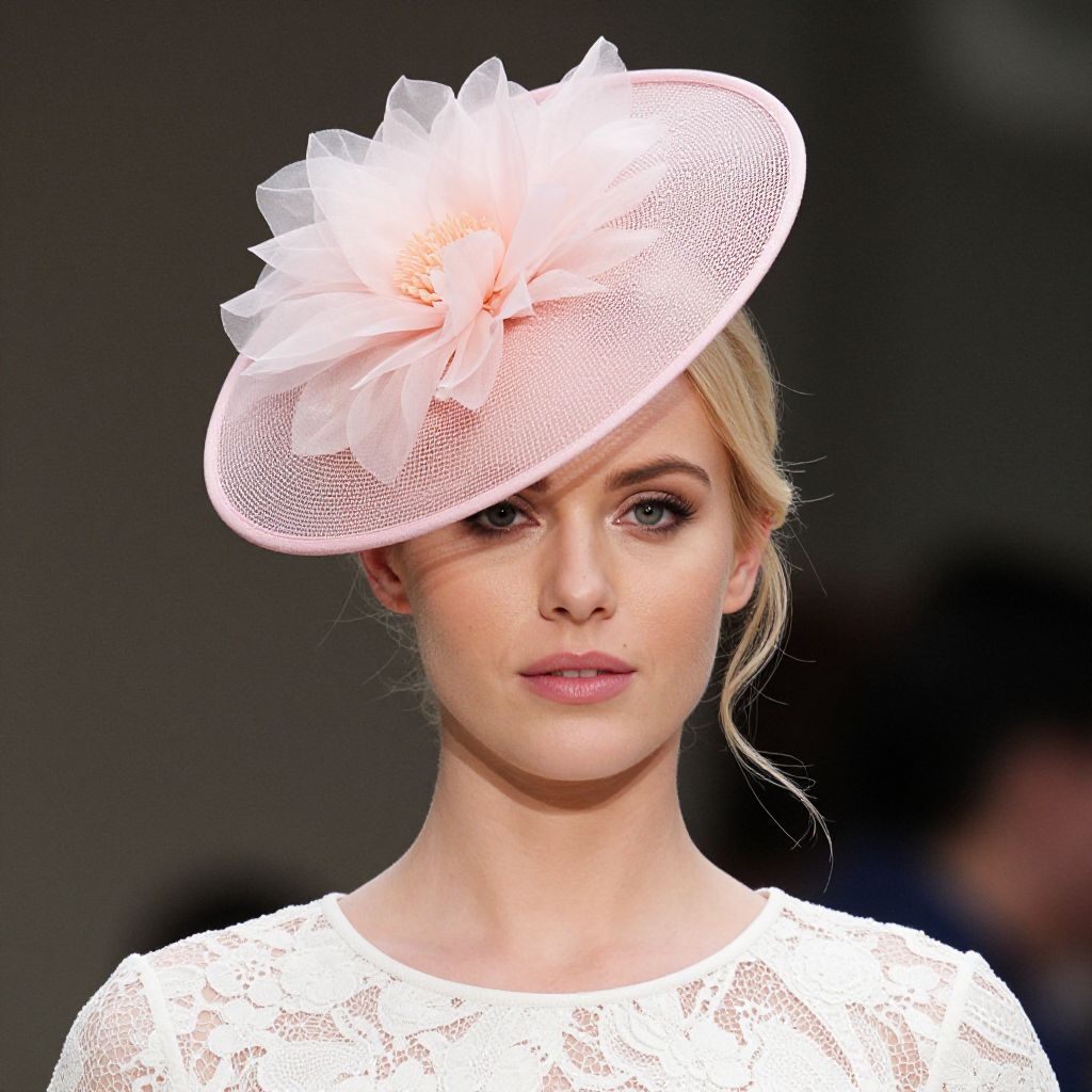Photograph of a fair-skinned, blonde woman with subtle makeup, wearing a white lace top. She has a delicate, pink, mesh fascinator with a large, pale pink, petal-like flower on the side. Her hair is neatly styled in a low bun. The background is dark, making her and her attire stand out prominently. The image focuses on her upper body and face, highlighting the elegance of her outfit and accessory. The lighting is soft, emphasizing her serene expression.