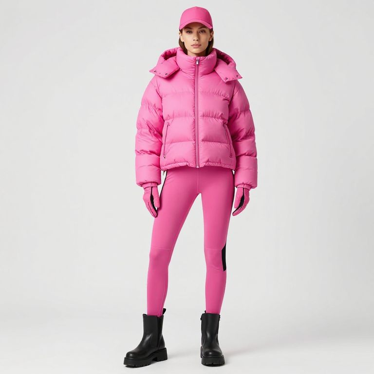 "Individual, sporty urban, vibrant pink puffer jacket with high collar and hood, horizontal quilting, cuffed sleeves, front zipper, matching pink slim-fit trousers with raised seams, black accents at the knees, pink baseball cap with visor, pink insulated gloves, chunky black ankle boots, white studio background.. Sexy. Pretty face and beаutiful eyes. Big breasts."