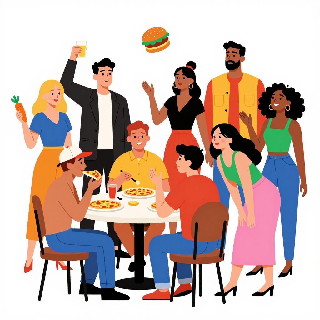 Digital illustration of a group of 7 people against an orange background. Central figure, brown-haired man with mustache, pulls down blue shirt to reveal toned abdomen. Surrounding people: black-haired man in blue shirt, blonde woman in purple dress, blonde man in white shirt, blonde woman in red shorts, bearded man in blue shirt, woman in blue tank top, and blonde woman in striped top. Sunburst pattern behind central figure.