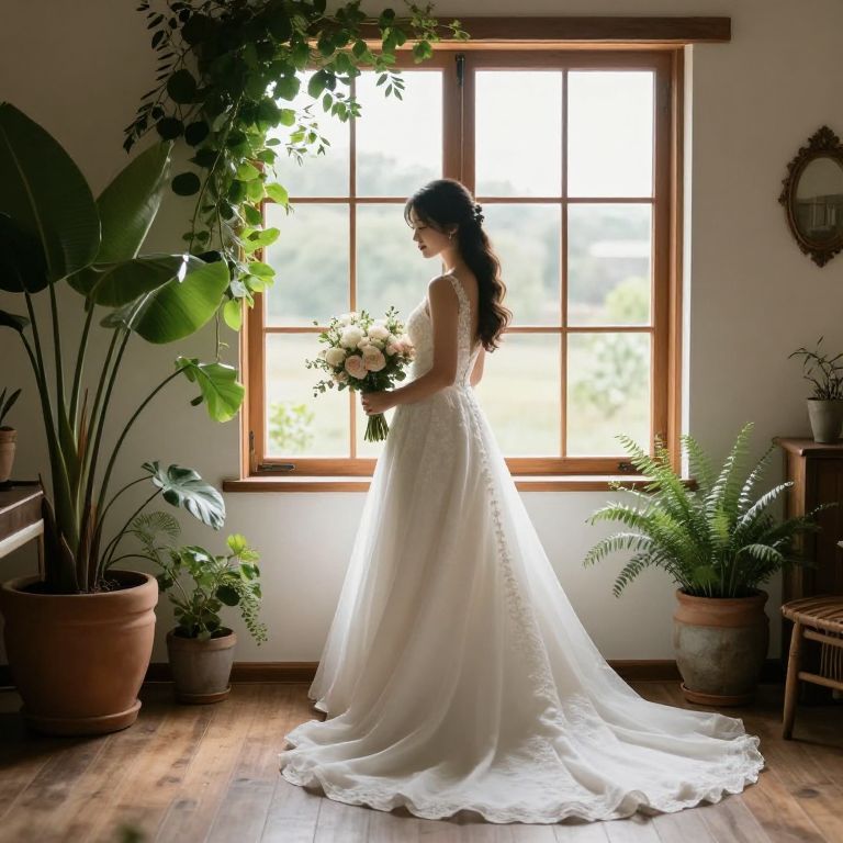 Backlit bride in a flowing white wedding gown stands gracefully by a large wooden-framed window, her hands gently cradling a bouquet of soft pink and white flowers, surrounded by lush green foliage and rustic decor in a warmly lit room.