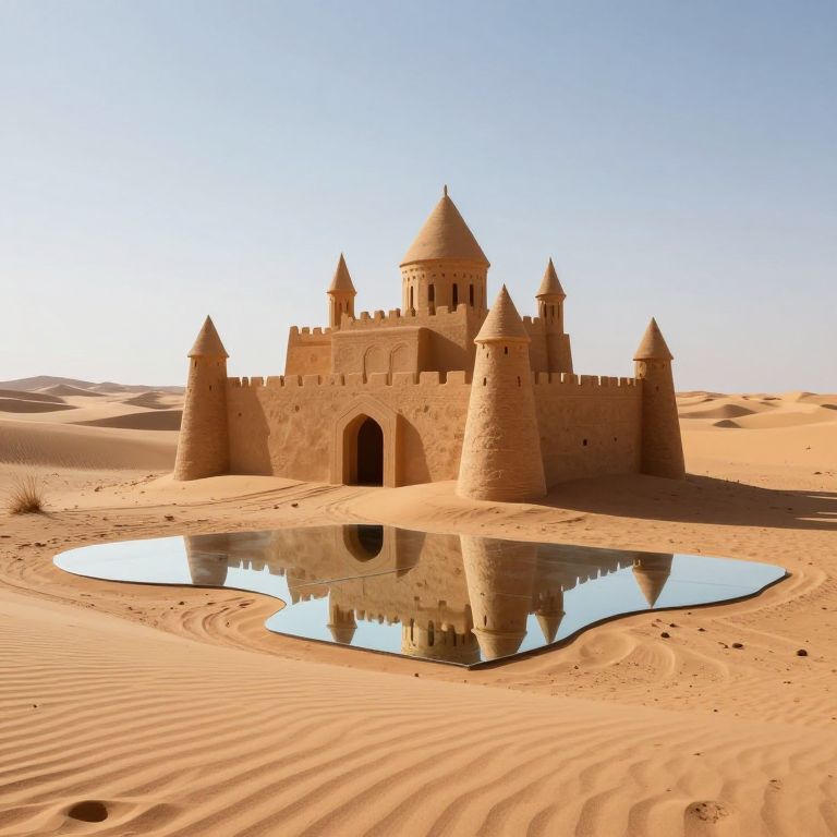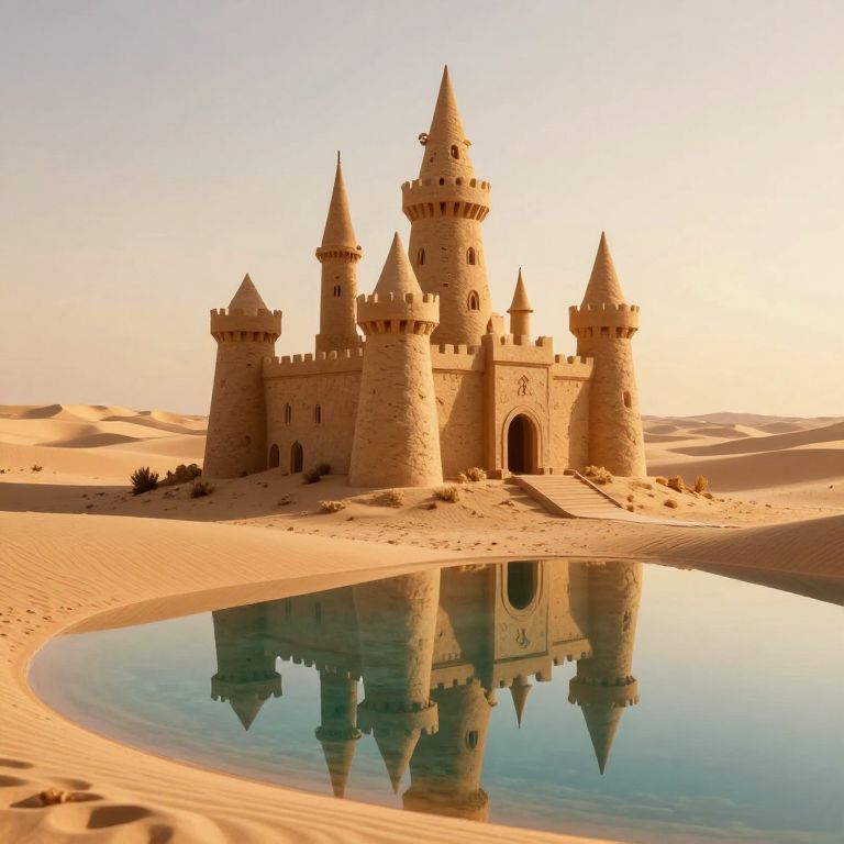 Imaginary sandcastles rise majestically against the starlit sky, their intricate spires and turrets perched atop sculpted dunes, as if crafted by unseen hands under the watchful gaze of the cosmos.
