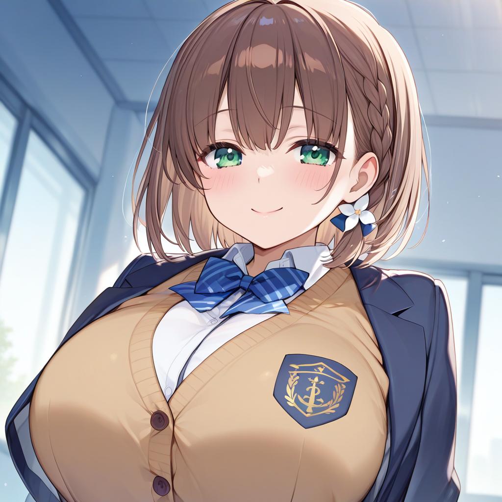Ai-chan (tawawa), getsuyoubi no tawawa, 1girl, green eyes, short hair, brown hair, side braid, large breasts, school uniform, by artist muryotaro, illustrious