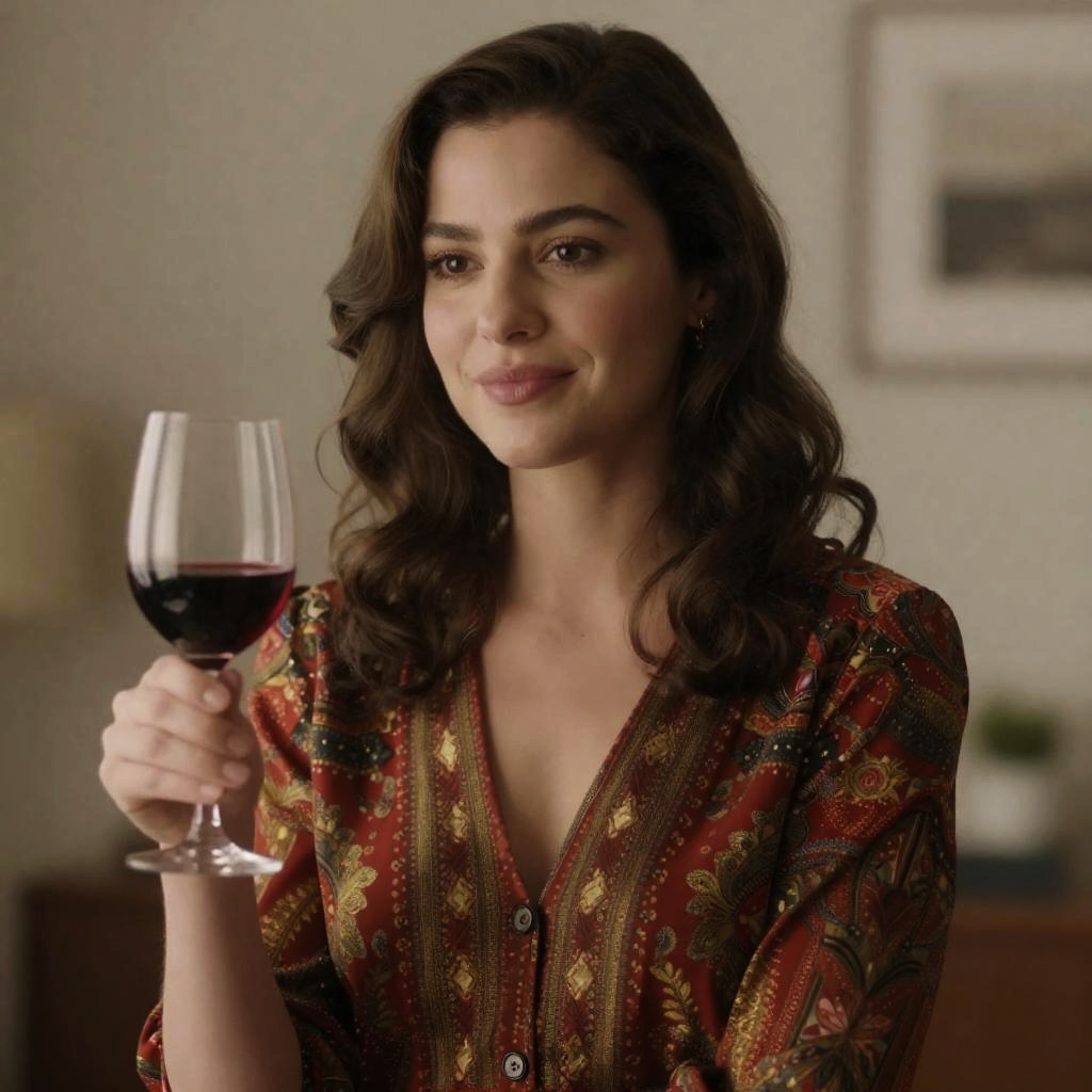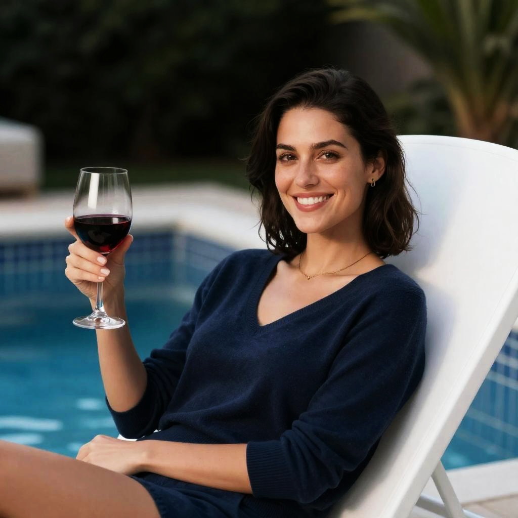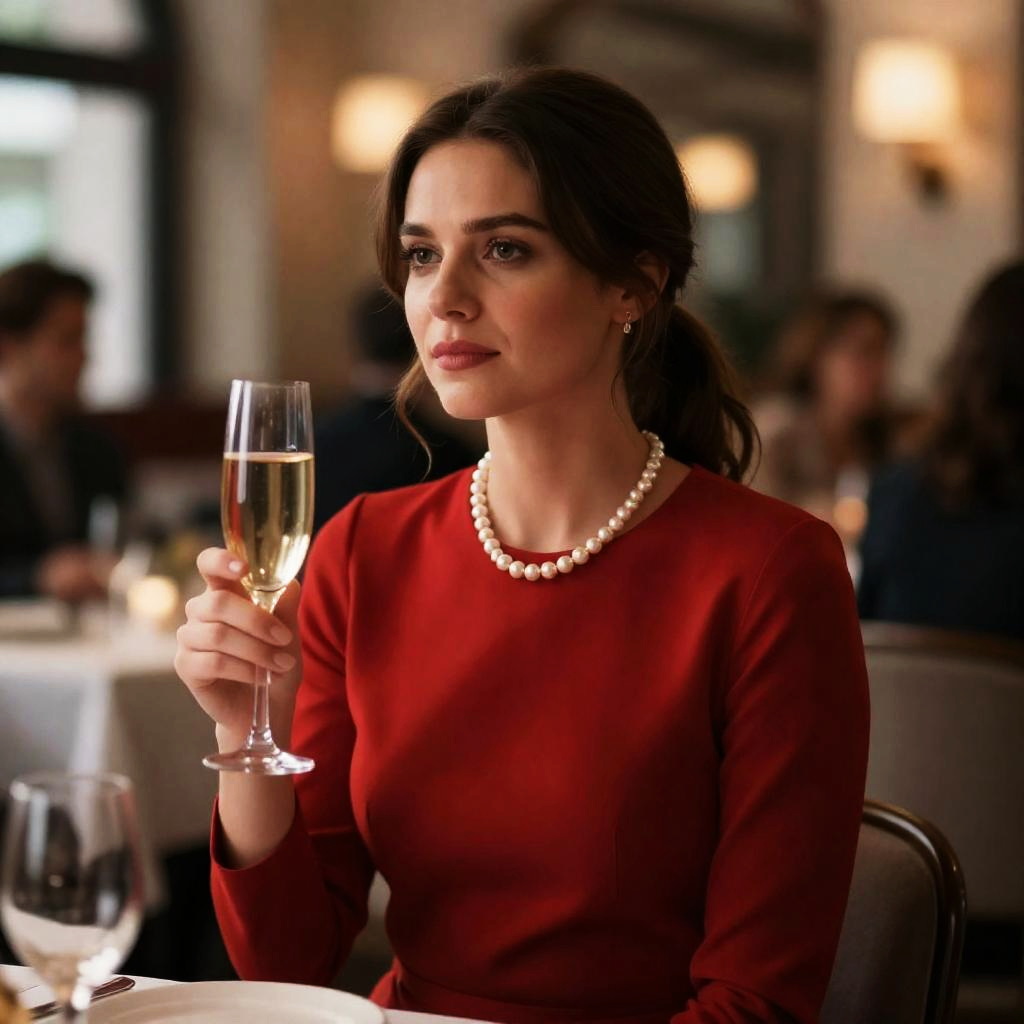 Photograph of a woman with curly blonde hair, wearing a black halter top, holding a glass of wine, looking to the right with a subtle smile. Foreground includes blurred desserts and floral arrangements. Dim, dark background. One person, table setting, wine glass.