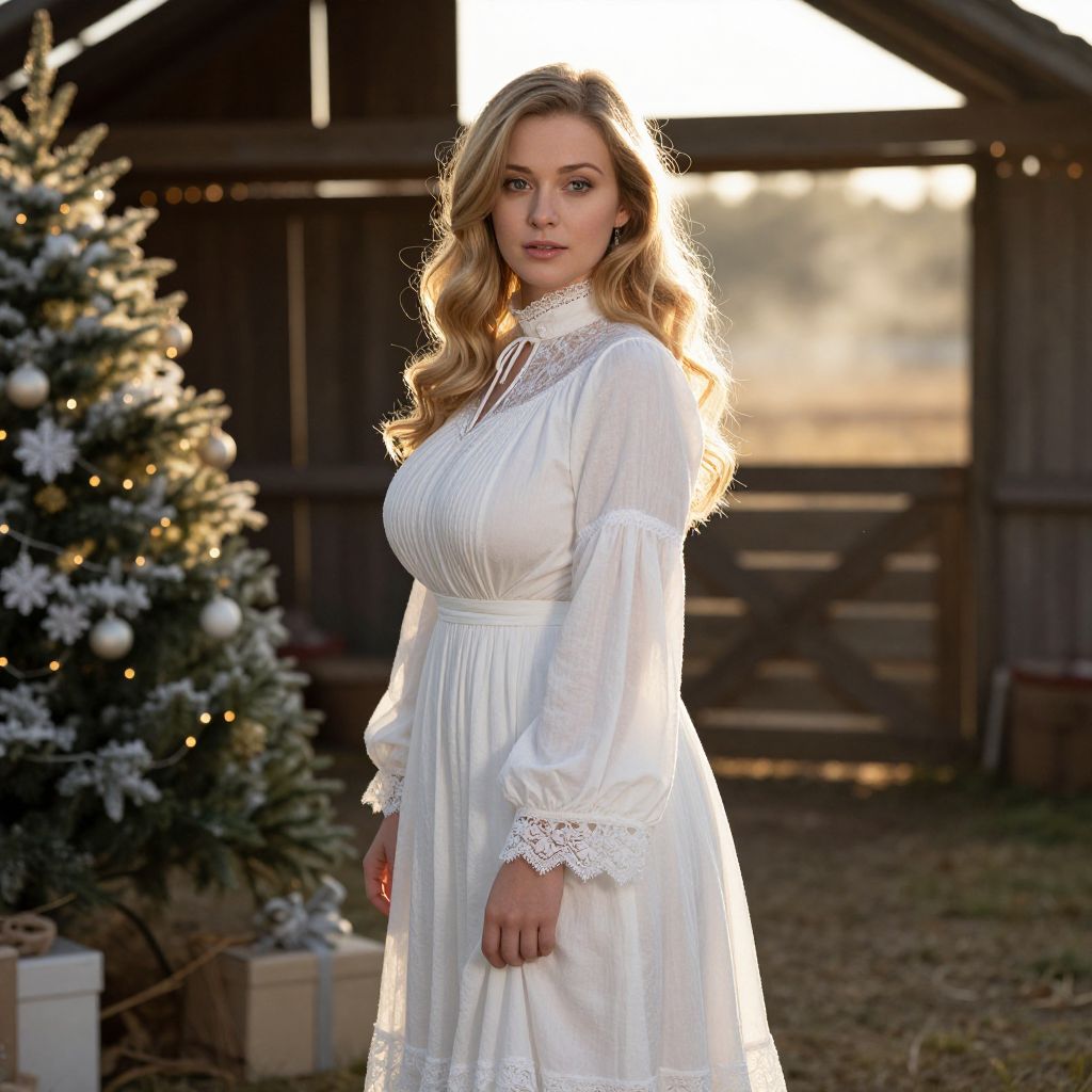 A stunning woman with long, wavy blonde hair and soft blue eyes stands in a rustic barnyard during golden hour, wearing a flowing white dress outfit with lace trim and a high collar, the sunlight catching the fabric as she turns slightly to the camera, setting the scene in a vintage Christmas costume theme with decorated trees and misty winter lights in the background.. The woman has big tits and cute face
