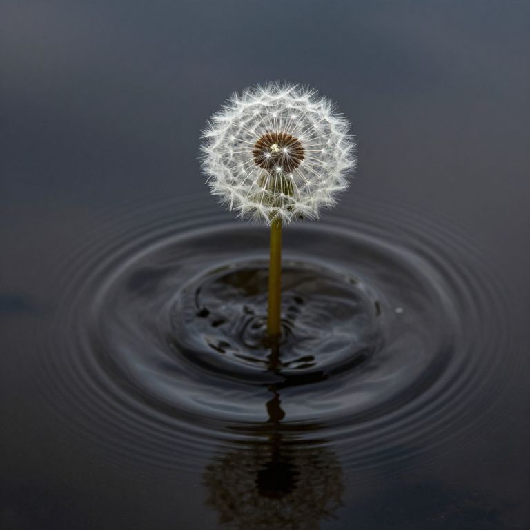 Lone dandelion seedhead stands upright above a dark, rippling puddle, its delicate white fluff contrasting sharply against the swirling concentric circles of water disrupted by a central black hole-like void.