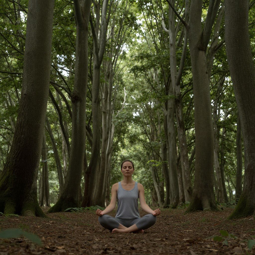 Woman meditating peacefully in a serene forest, surrounded by tall trees and dappled sunlight filtering through the canopy.