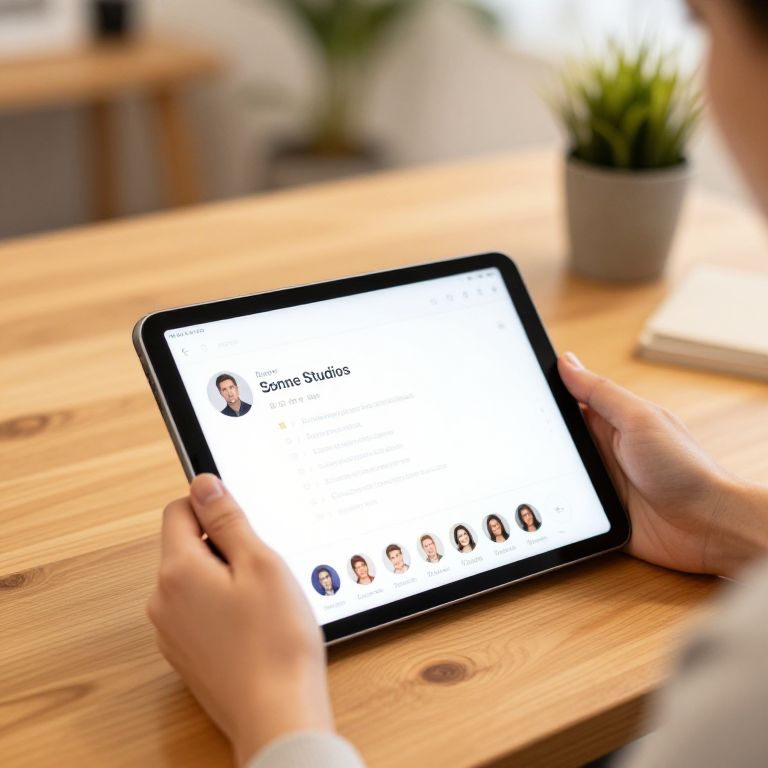 Close-up of Sonne Studios reviews on a tablet held by a trendy user in a cozy creative workspace, warm wood textures, potted plants in background, soft natural lighting, modern minimalistic design with focus on user experience and satisfaction