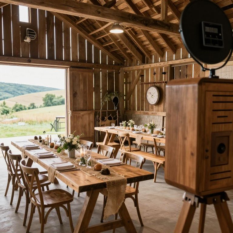 A rustic wedding reception in a countryside barn, with wooden tables, burlap decor, and a rustic photo booth, set against a backdrop of rolling hills and soft natural lighting.