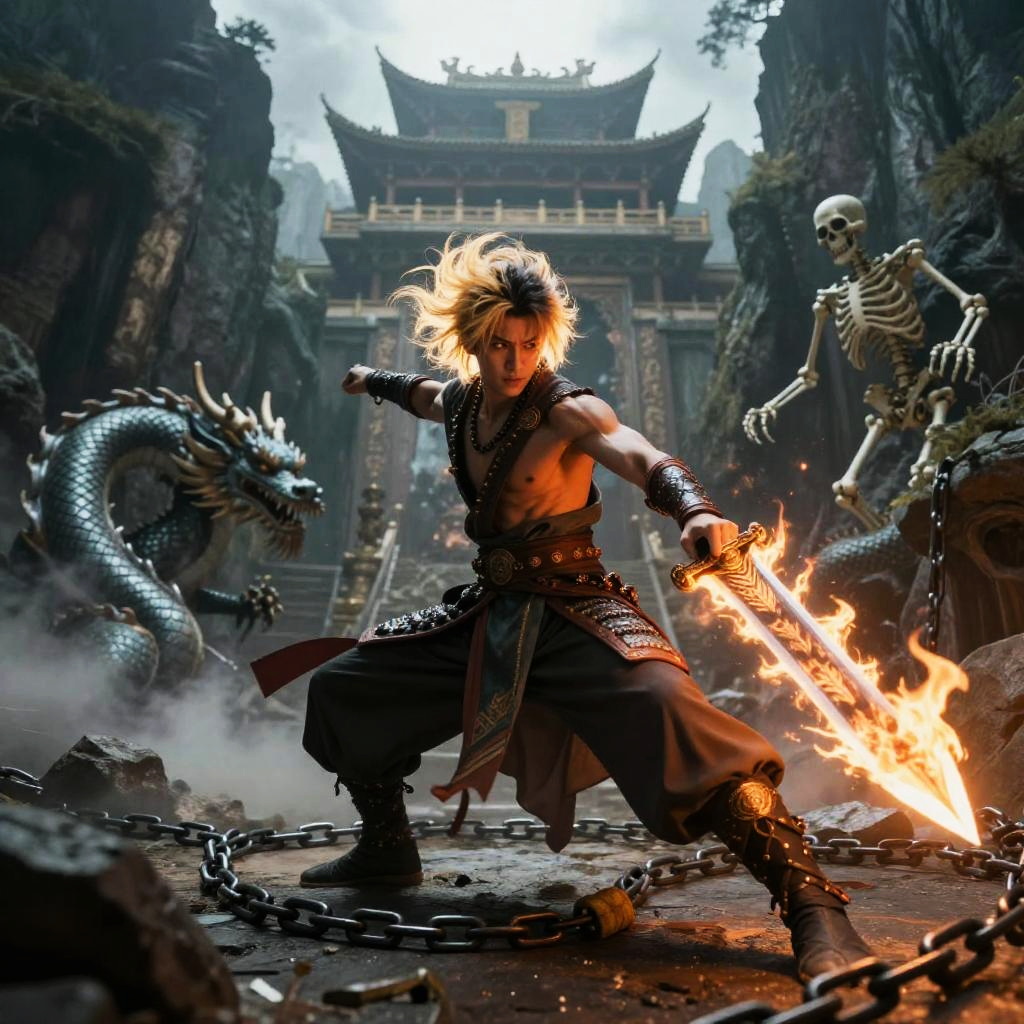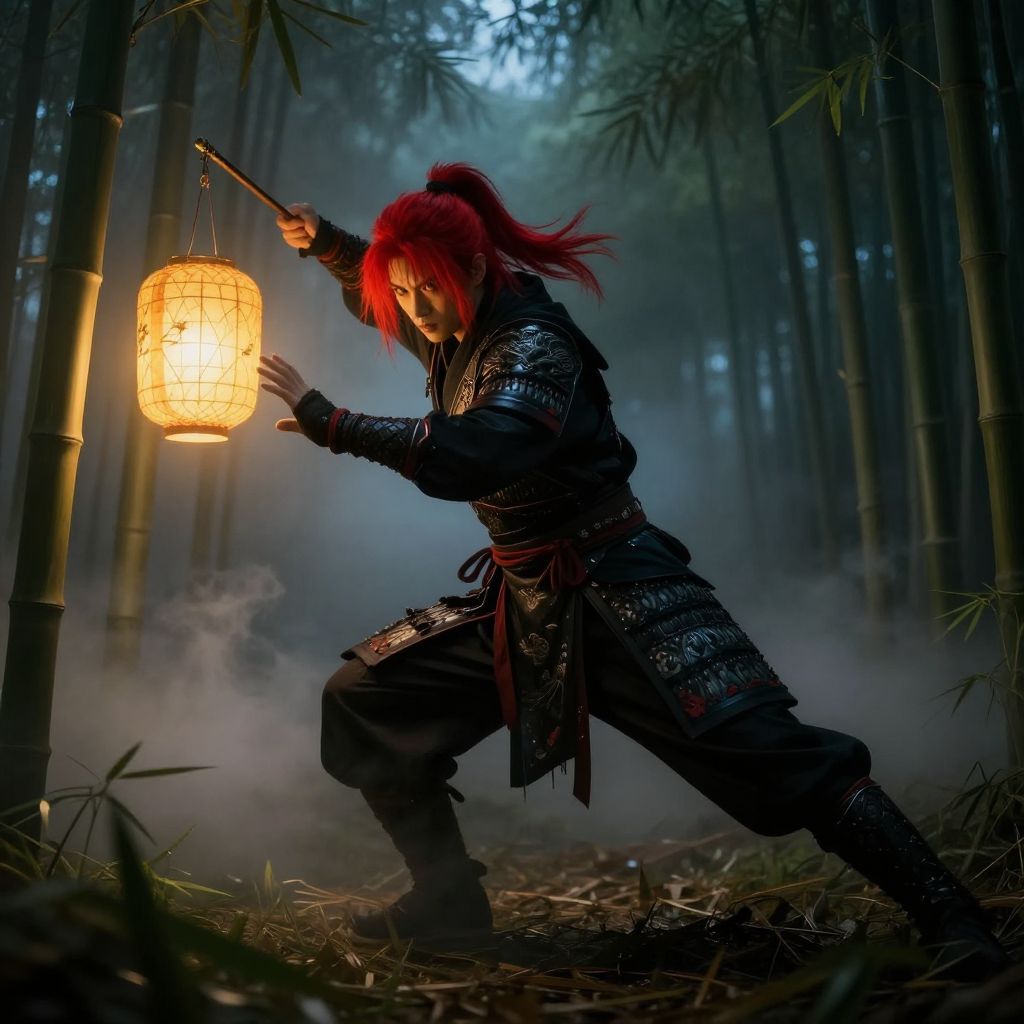 Ninja with red hair stealthily moving through a foggy bamboo forest at night, illuminated by lanterns, intricate armor details, dynamic action pose, cinematic lighting