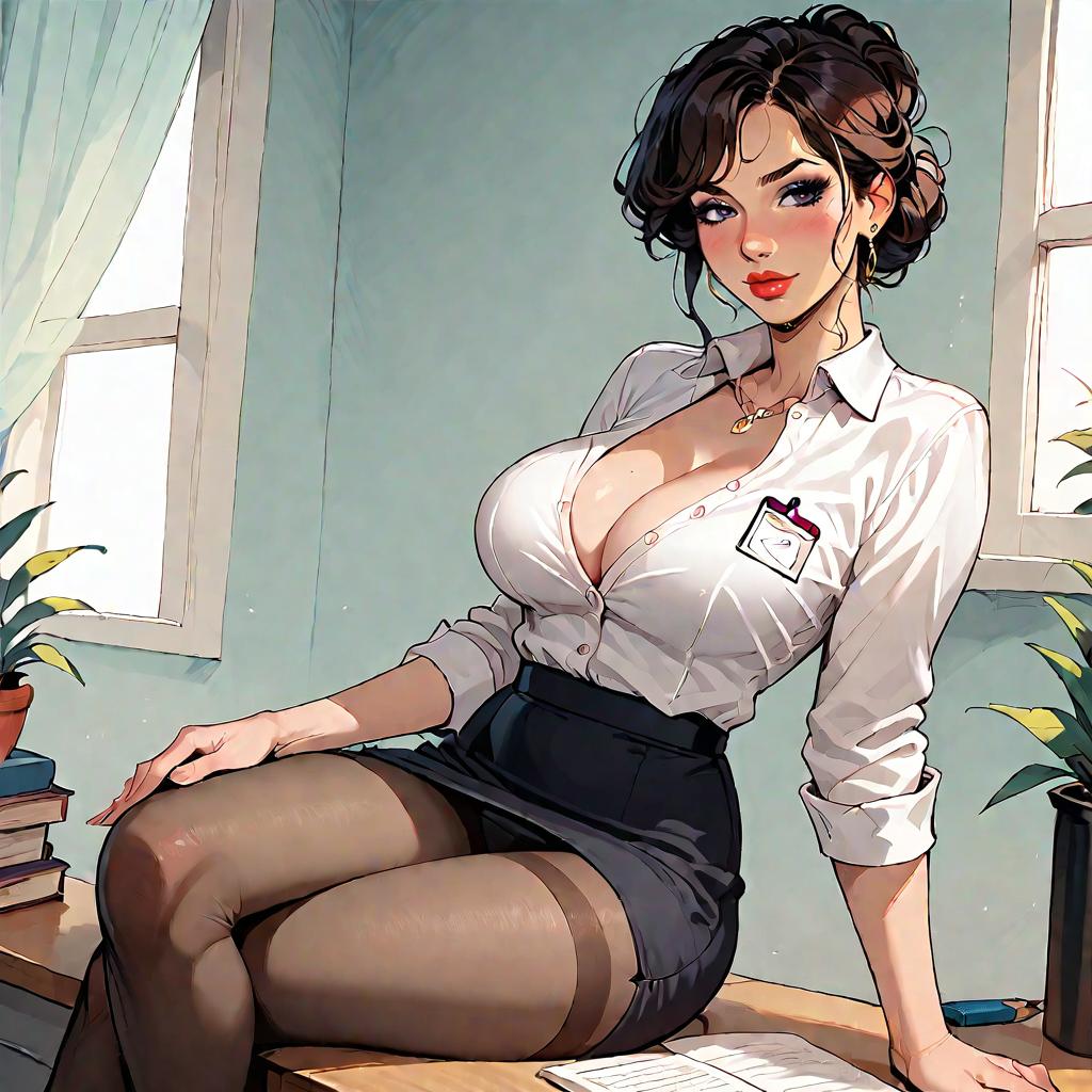 Score_9, score_8_up, source_anime 1girl, solo, brown hair, round eyewear, huge breasts, nurse cap, standing, wide hips, id card, arms at sides