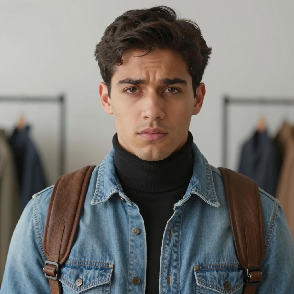 Fresh outfit guy, photorealistic portrait of a handsome young man, dark wavy hair, short beard, wearing a beige jacket with red straps, white t-shirt, standing on a busy urban street, slightly blurred background, daytime, natural light, casual style, street photography, bokeh effect, urban setting, confident expression