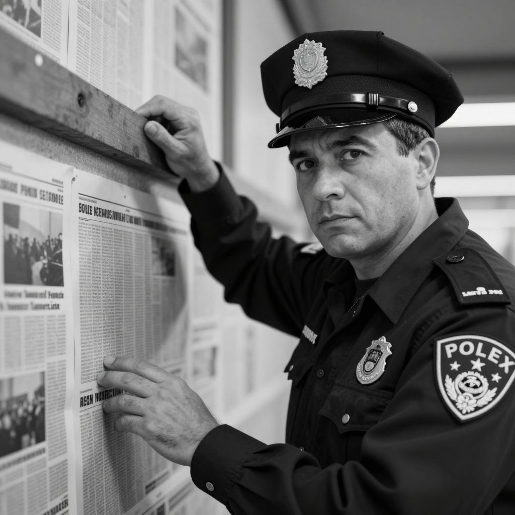 Black-and-white photograph of a middle-aged man with light skin and dark hair, wearing a police cap and work jacket, holding a wooden beam against a wall covered with newspaper posters. He has a serious expression and is positioned slightly to the right. The background includes blurred newspaper s and a rough wall.
