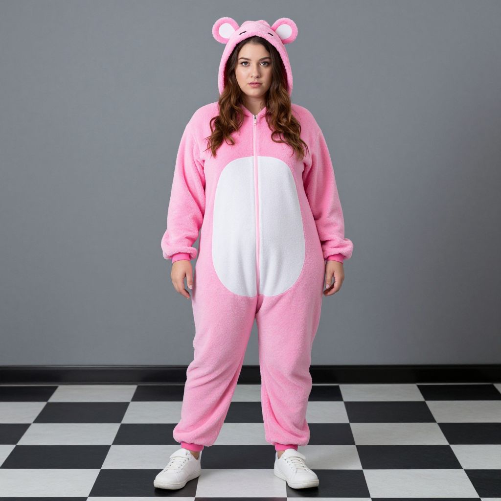 Plus Size Onesie Costume, a woman in a pink bear onesuit standing on a checkered floor