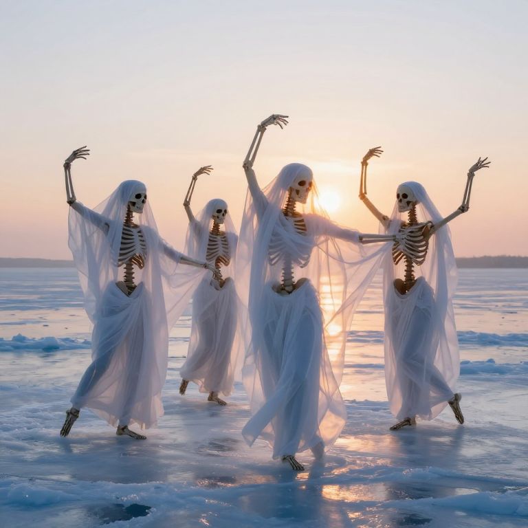 Four skeletal figures draped in ethereal white veils perform a synchronized dance atop a frozen ocean, illuminated by the radiant glow of the sun during an otherworldly twilight scene.