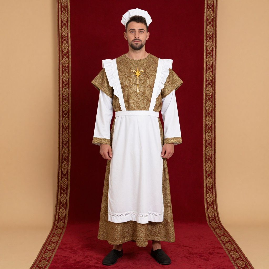 Servant Costume Nativity, man in traditional clothing standing in front of a red carpet