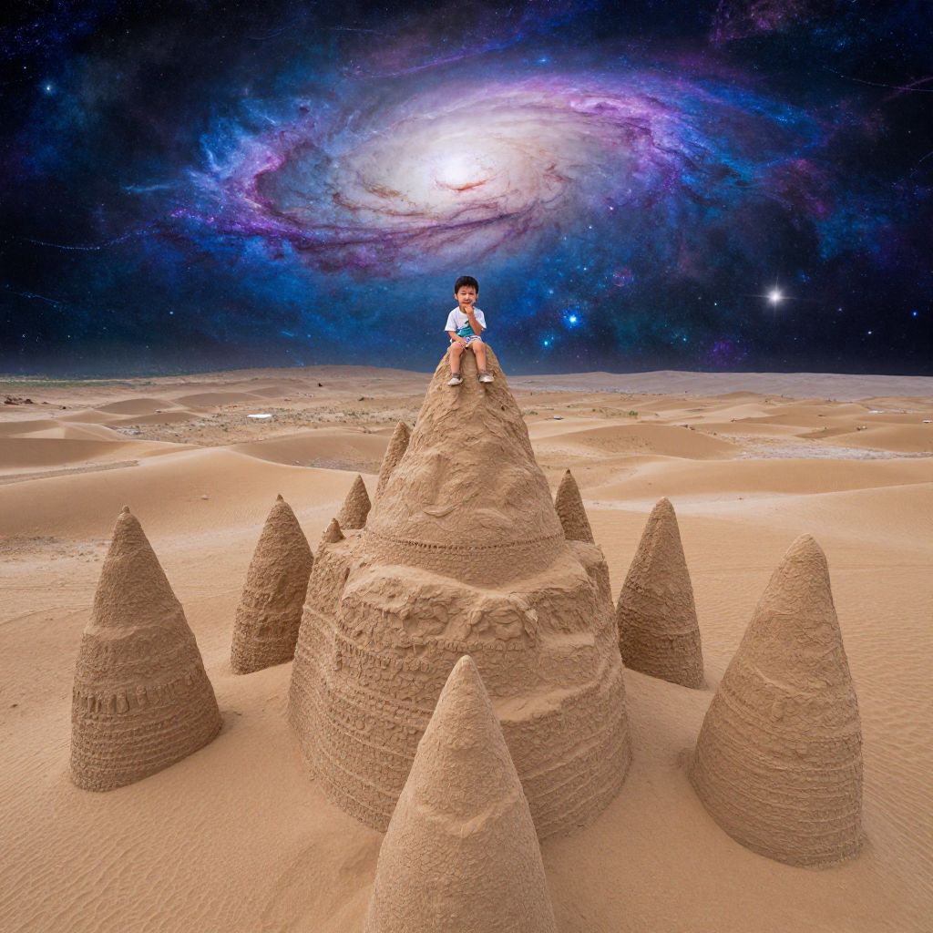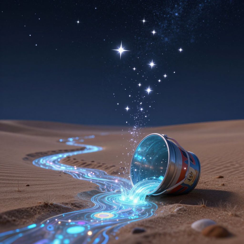 A child stands silhouetted against a starlit sky as an overturned bucket spills a luminous, star-filled liquid that pools and radiates like a constellation come to life, transforming the desert into a bioluminescent dreamscape.
