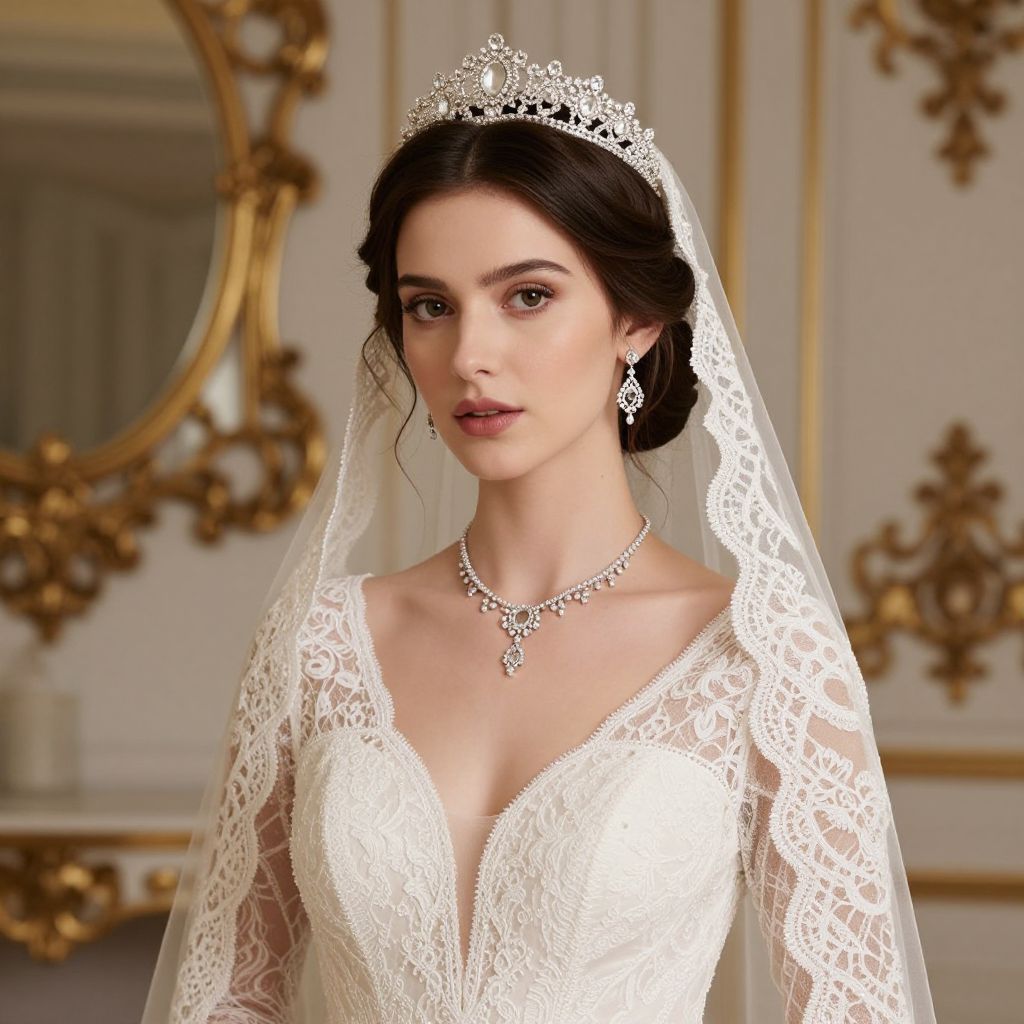 Photograph of a beautiful woman with fair skin and dark brown hair styled in an elegant updo, wearing a sparkling tiara and a detailed white lace wedding dress with a deep V-neck. She has a delicate, intricate necklace and matching earrings. Her veil is sheer with lace edges, and she stands in a warmly lit, ornate room with blurred golden framed mirrors in the background.