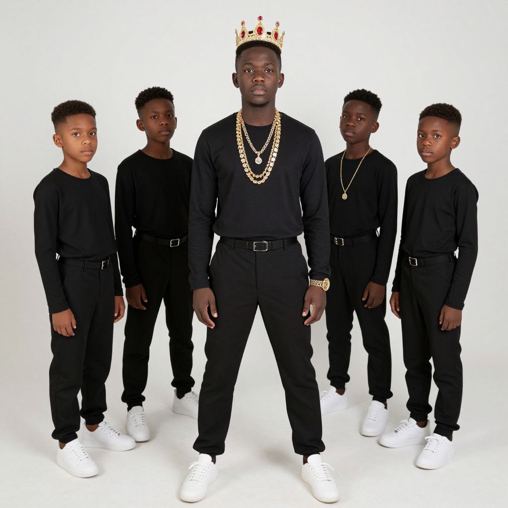 Photograph of six young Black males standing against a white background. The central figure, wearing a gold crown with red and green jewels, a black long-sleeve shirt, black pants, white sneakers, and multiple gold chains, stands confidently with his arms slightly apart. He is flanked by five other boys in identical black long-sleeve shirts, black pants, and white sneakers. They all have short, neatly styled hair and are looking towards the camera with neutral expressions. The image has a clean, studio-like quality with bright, even lighting. The boys' outfits and accessories suggest a coordinated, fashion-forward style.