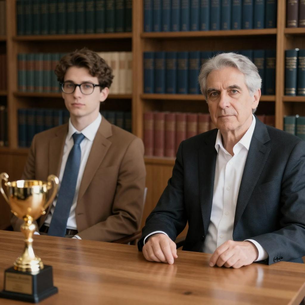 Photograph of two men in a library. Older man with gray hair, wearing a dark suit and white shirt, sits at a wooden table with hands resting on it. Younger man with brown hair, glasses, brown suit, white shirt, and blue tie, sits to the left. Background features tall bookshelves filled with dark books. Golden trophy on table. Older man has a serious expression, younger man looks focused.