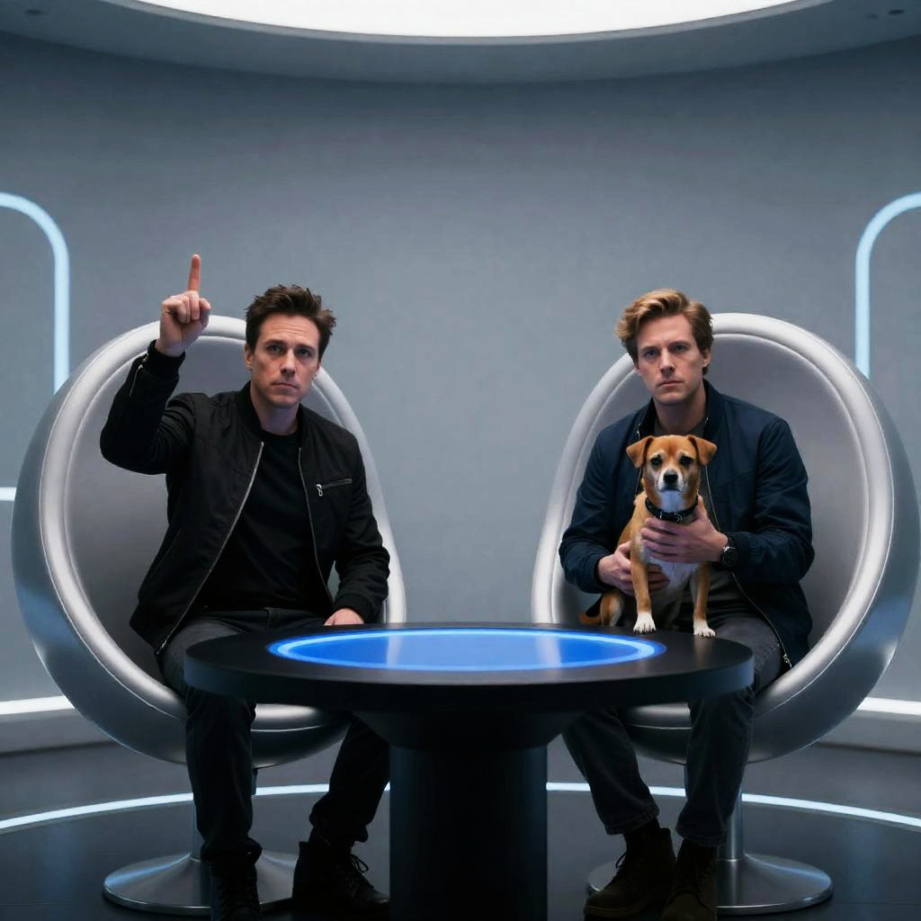 Photograph of two men in a futuristic room. Man on left raises finger, wearing black jacket, dark hair. Man on right holds brown dog, wearing blue jacket, light brown hair. Both sit in large, circular, silver chairs. Black table with blue-lit center. Background has vertical light patterns on walls. Intense expressions.