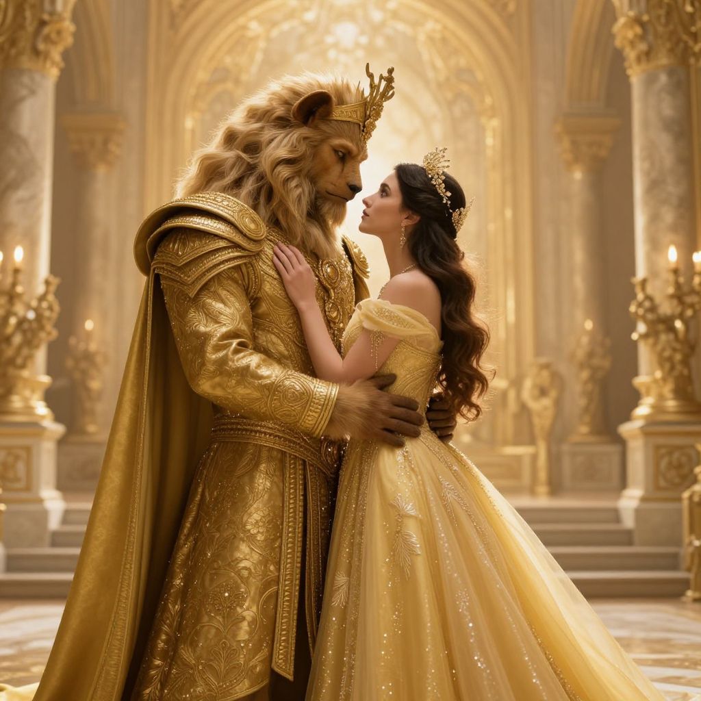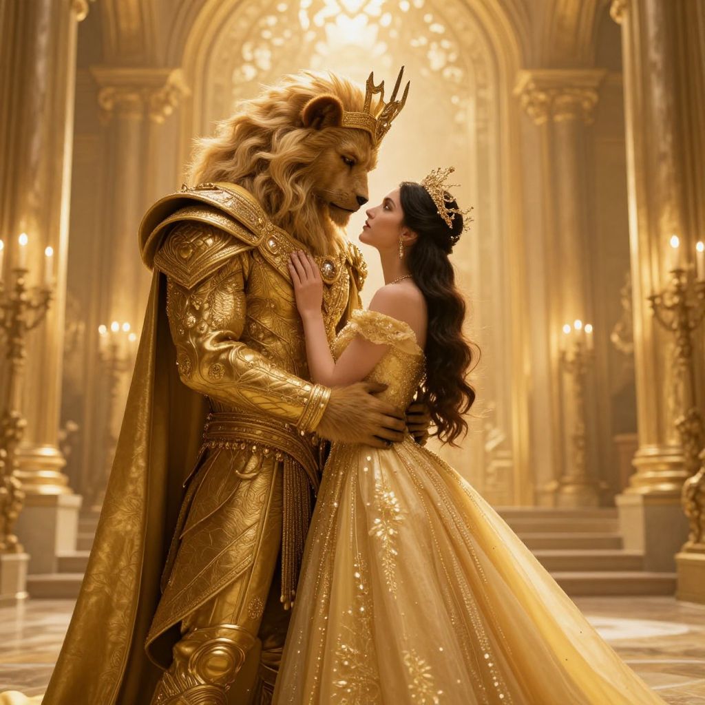 A digital fantasy illustration features a lion-headed, muscular male figure in ornate, gold armor with a regal crown, embracing a slender, dark-haired woman in an off-shoulder, golden ball gown adorned with intricate patterns. They stand in a grand, opulent hall with tall, arched windows and warm, golden lighting, illuminated by multiple candles in ornate holders. The lion-headed man gazes lovingly at the woman, who looks up at him with a serene expression. The background showcases elegant, classical architecture, enhancing the romantic, fairy-tale atmosphere. The image is highly detailed and rich in texture, emphasizing luxury and fantasy.