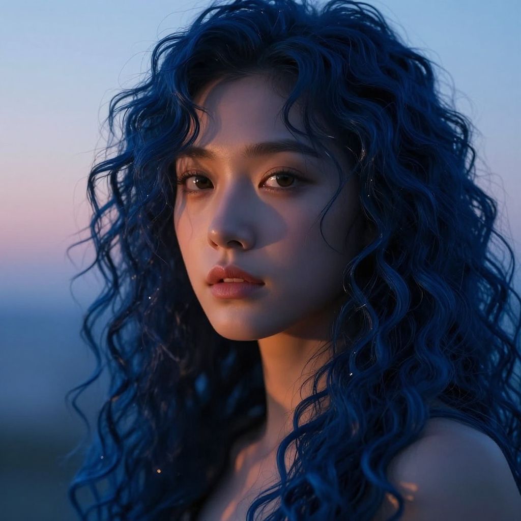 Dark blue hair curly tresses framing a serene face, glowing under twilight hues, intricate hair texture, cinematic composition, soft shadows, fantasy character, 4k render