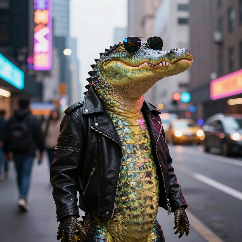 Anthropomorphic alligator standing upright in a bustling city street, wearing a stylish leather jacket and sunglasses, neon lights reflecting off its scales, cyberpunk atmosphere.
