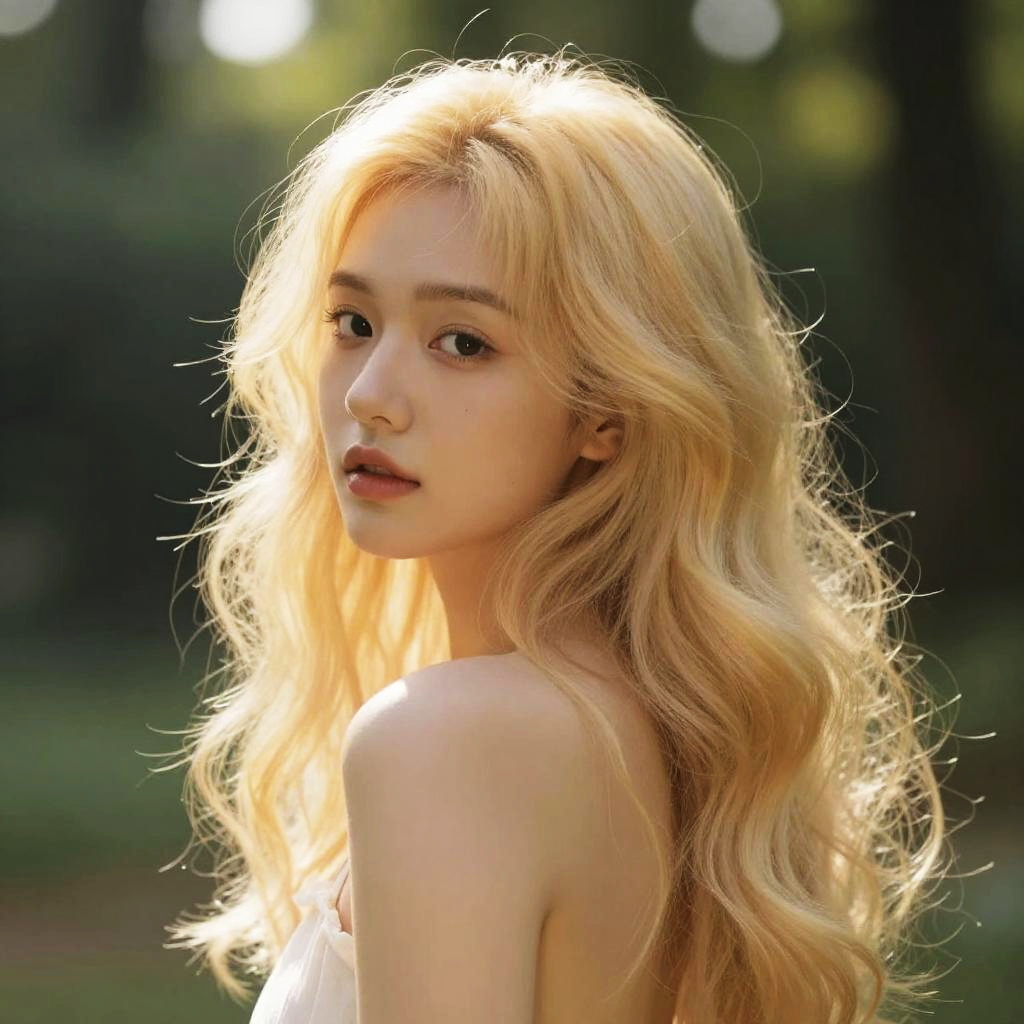 Blond fluffy hair cascading in soft waves, glowing under warm sunlight, with a dreamy forest background, ethereal atmosphere, high detail, fantasy portrait style, delicate texture, natural light highlighting the hair's volume and softness.