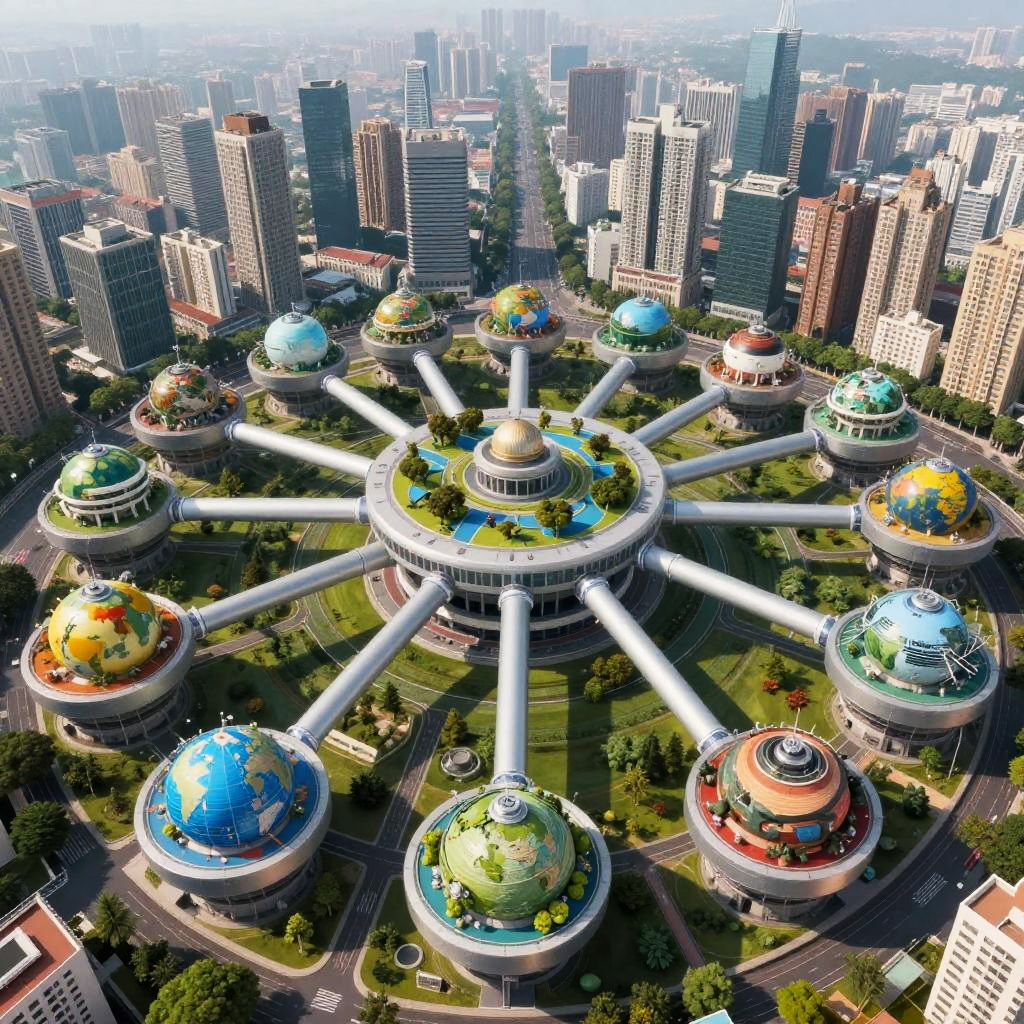 Aerial photograph of a futuristic cityscape featuring a central white dome structure with colorful, globe-topped satellite buildings surrounded by high-rise buildings. Vibrant