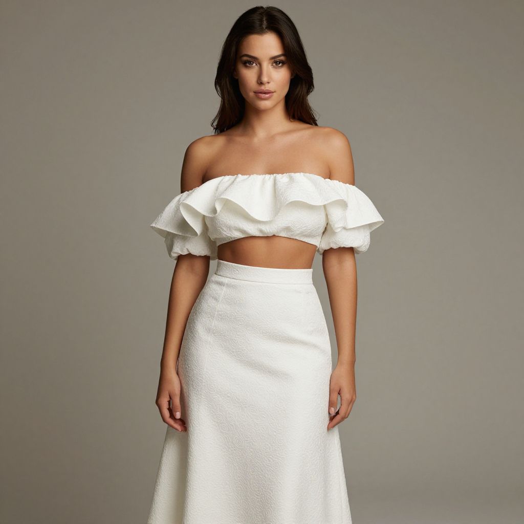 "Woman, contemporary romantic, white two-piece ensemble, off-the-shoulder crop top with large ruffle detail, matching high-waisted skirt with A-line silhouette, midi length, structured fabric with subtle floral texture, solid background with soft lighting.. Sexy. Pretty face and beаutiful eyes. Big breasts."