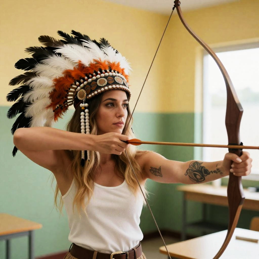 Young woman with long blonde hair wearing a white tank top and a large feather headdress in white, black, and orange. She is indoors in a room with yellow and green walls, aiming a brown wooden bow with a focused expression. Visible tattoos on her right arm.