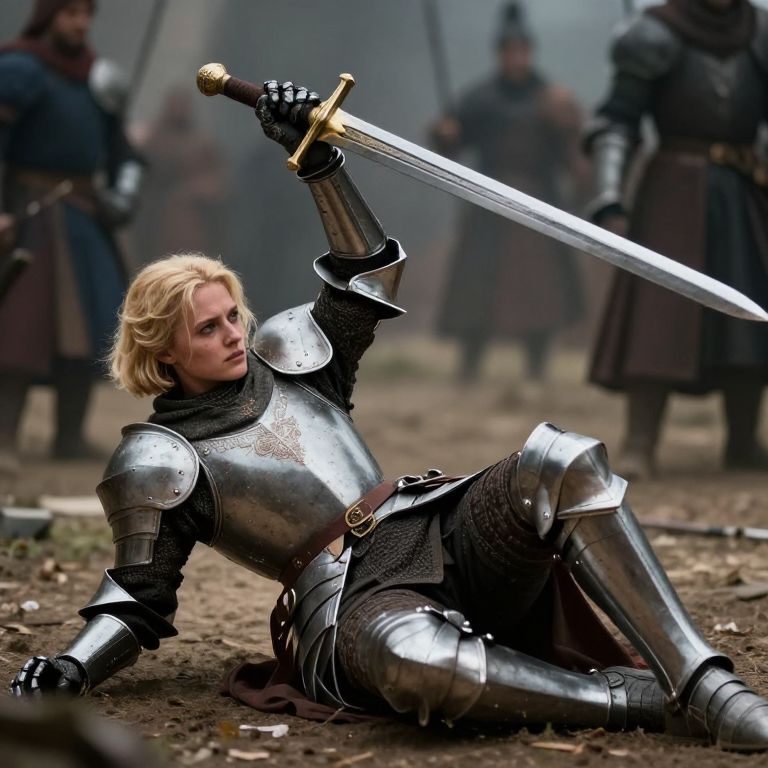 A female knight of a holy order fights for her life as she is knocked the ground, raising her worn iron long sword above her head to defend against an impending strike, She wear holy templar knight armor, has short cropped blonde hair, She looks battleworn and weary but determined, Action scene, cinematic, well posed, very pretty and attractive, battle field background but focusing more on the story of the scene we are presented, focusing on her struggle for survival
