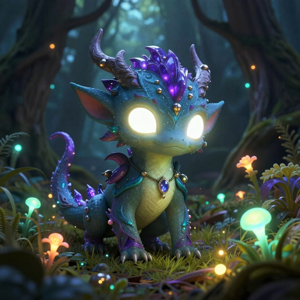 Carbuncle creature, small magical beast with ruby-like eyes, intricate crystalline scales, surrounded by swirling magical energy, vibrant colors, high detail