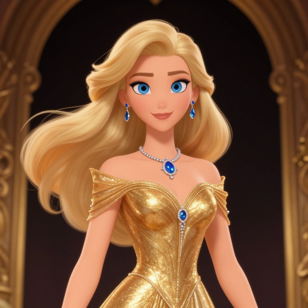 An elegant animated woman with flowing blonde hair and striking blue eyes is adorned in a shimmering gold gown. She is accessorized with intricate blue gemstone jewelry, set against a dark background framed by ornate gold details, evoking a luxurious and regal atmosphere.