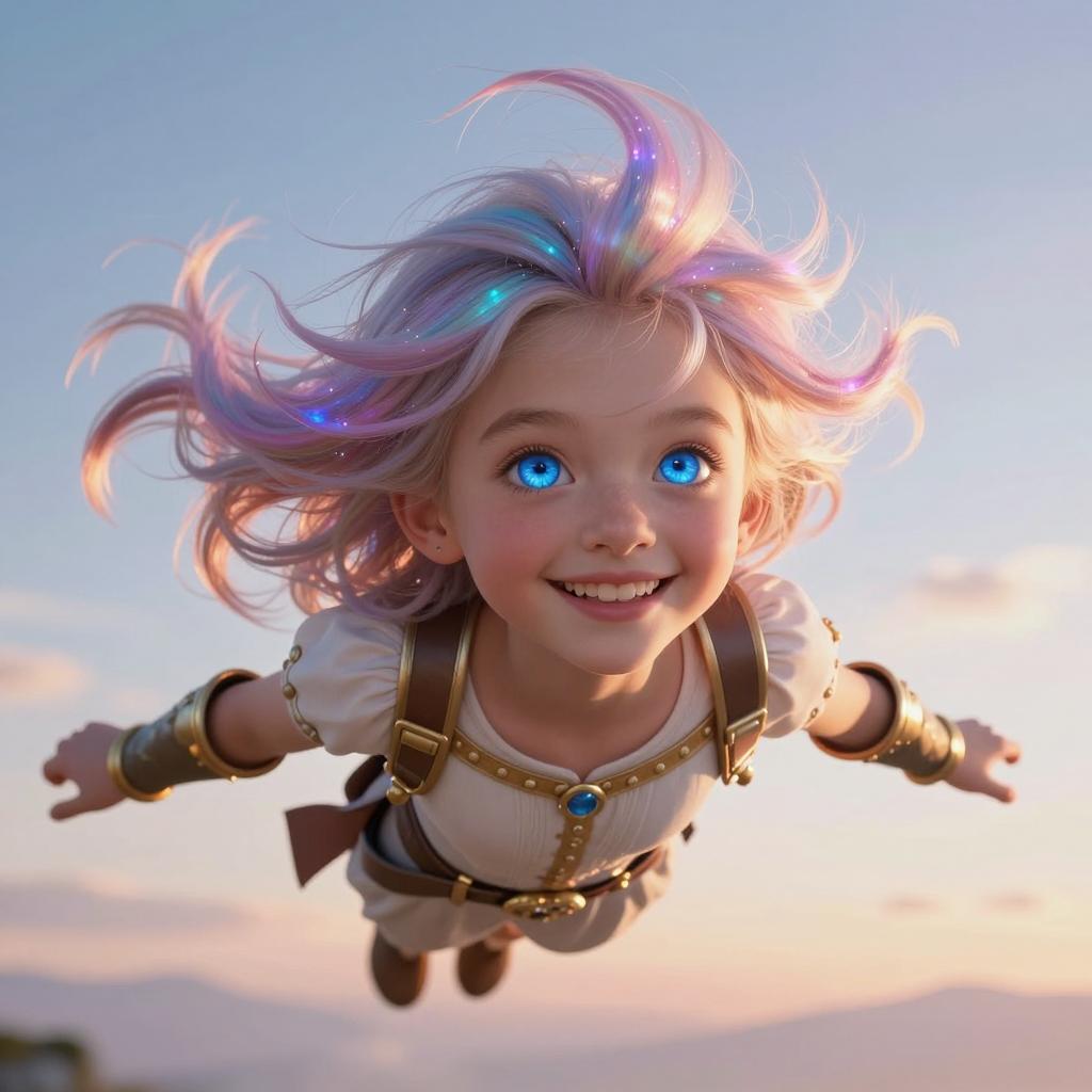 Highly detailed fantasy portrait of a joyful young girl with striking blue eyes and iridescent glowing hair, wearing white and gold adventuring gear with leather straps and brass accents. The girl is depicted mid-flight against a beautiful sunset sky, with wind blowing through her hair and a radiant, magical aura.