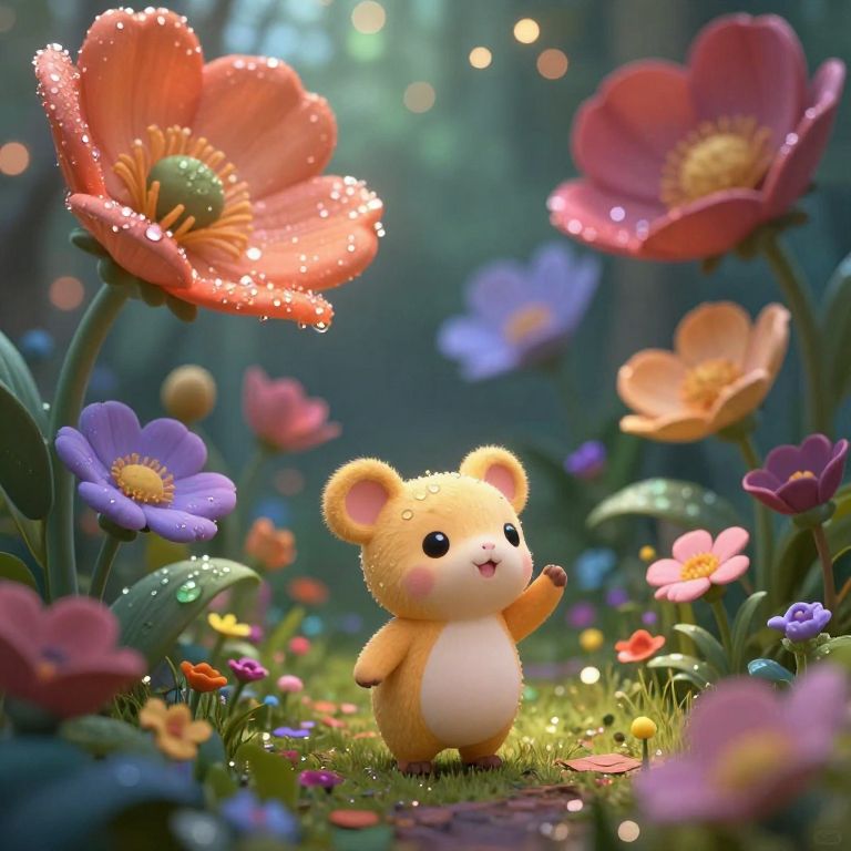 Toadette exploring a magical garden filled with oversized flowers and sparkling dew, rich colors and textures, dreamy background with bokeh lights, delicate and expressive character pose, fantasy style artwork with dynamic lighting