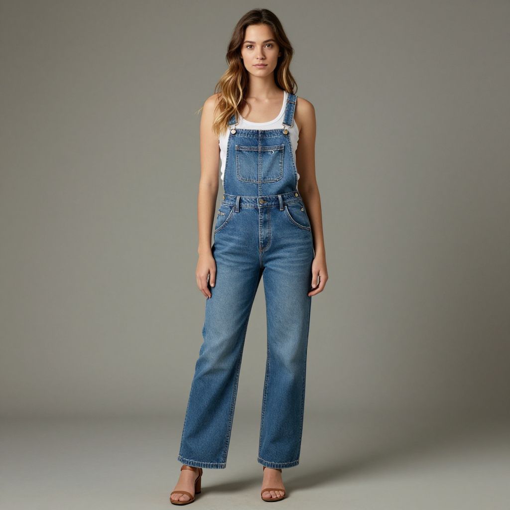 Photograph of a young Caucasian woman with wavy, shoulder-length brown hair standing against a plain gray background. She wears a sleeveless, blue denim overall dress with white straps over a white tank top, and brown flat sandals. The overall dress has a high waist and slightly flared legs. Her expression is neutral, and she stands with her arms relaxed at her sides. The overall texture of the denim appears slightly worn, adding a casual, vintage touch to her outfit. The lighting is even, highlighting the denim's color and texture.