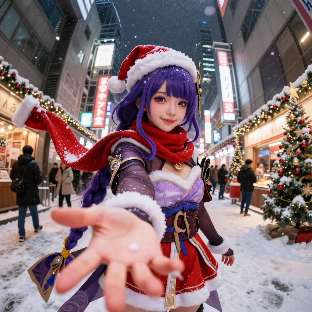 Ultra-detailed high-resolution image of a female anime character cosplay inspired by Raiden Shogun standing in a snowy Tokyo street at night. The character has purple hair, wearing a festive Christmas dress with red, purple, and white fur trims, a red scarf, and a Santa hat. She is reaching out her hand toward the camera with a smiling expression. The street is decorated with Christmas lights and trees covered in snow, surrounded by urban buildings and pedestrians in winter clothing. The image uses exaggerated perspective and a fisheye lens effect, capturing a lively and festive atmosphere.