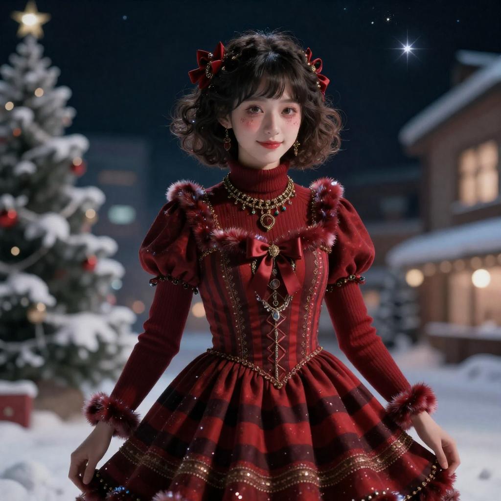 Ultra-detailed, (best quality), ((masterpiece)), (highres), original, extremely detailed 8K wallpaper, (an extremely delicate and beautiful), anime, 1girl, raiden shogun, purple hair, solo, looking at viewer, smile, Exaggerated perspective, ultra wide shot, reaching out hand, foreshortening, on the tokyo street, realistic, highres, female focus, snowy day, scarf, hat, flying snow, fish-eye len, fish eye angle, ambient occlusion, rim lighting, bustling, The streets at night wall in the Christmas, Red and green theme, Christmas dress, Christmas Hat, Christmas tree, Christmas elements