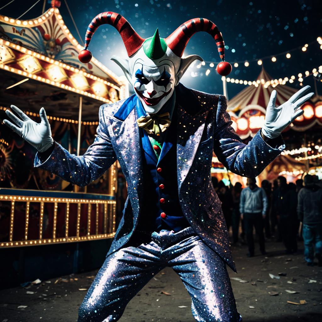 Silhouette of a man with a black top hat and red and black striped shirt, arms raised, hands spread, holding cigarettes. Bright spotlight behind. Foggy background with blurred crowd holding signs. Man facing away, profile visible. Crowd on both sides, some signs partially visible. Smoky atmosphere.