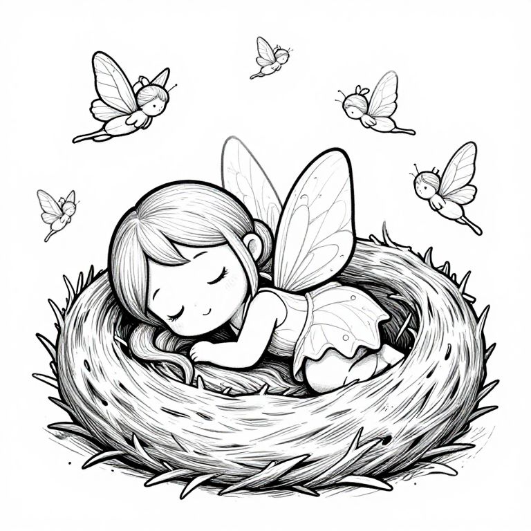 Ego Dissolution lovely water fairy sleeping in a cosy nest, fairies in the air, coloring book drawing, fine details, Chibi style, black and white, background solid white, thick bold lines,