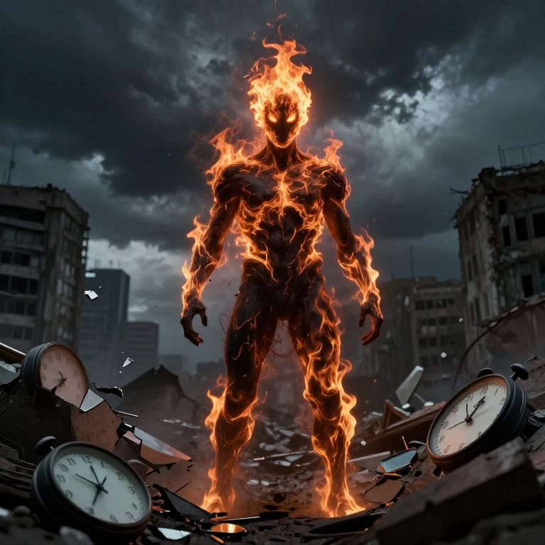 Digital art: Fiery, muscular, humanoid figure with blazing head and body stands amid shattered clocks and debris in a stormy, urban ruin.