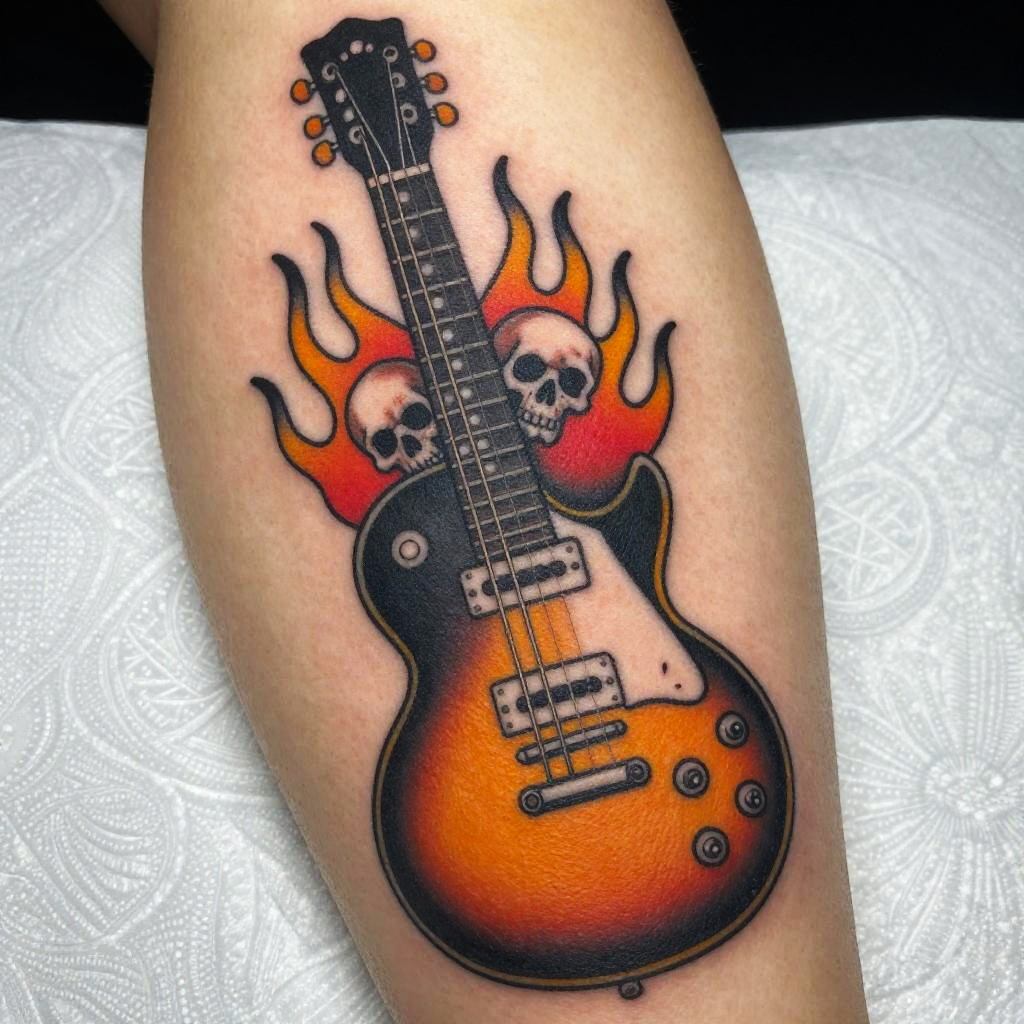 Close up of Les Paul guitar tattoo with intricate fretboard details, colorful flames and skulls entwined, done in neo-traditional tattoo style, vivid and dynamic colors.