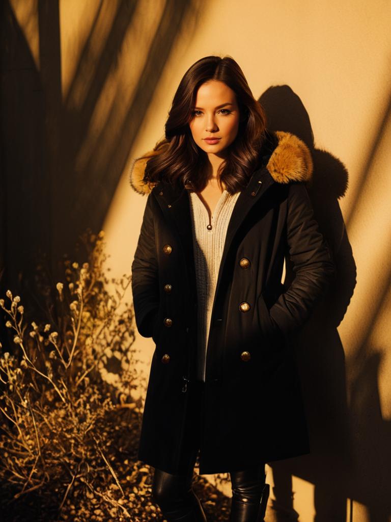 Woman, casual winterwear, warm caramel-toned parka with fur-lined hood, zip front with button placket, black leggings, chunky knit ivory sweater, mid-calf black leather boots with slight heel, neutral studio background. --sref 1393